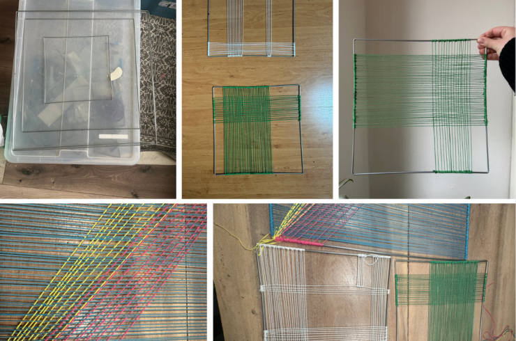 De panelen zijn vervaardigd uit gebogen metaaldraad, die aan elkaar zijn gepuntlast.Vervolgens heb ik verschillende weeftechnieken geprobeerd, waarbij ik ontdekte dat de horizontale en verticale lijnen het beste resultaat geven.