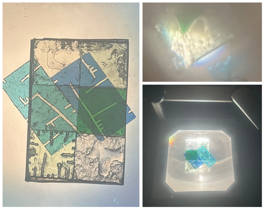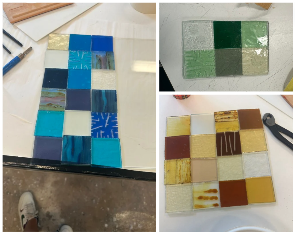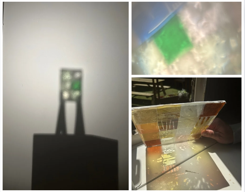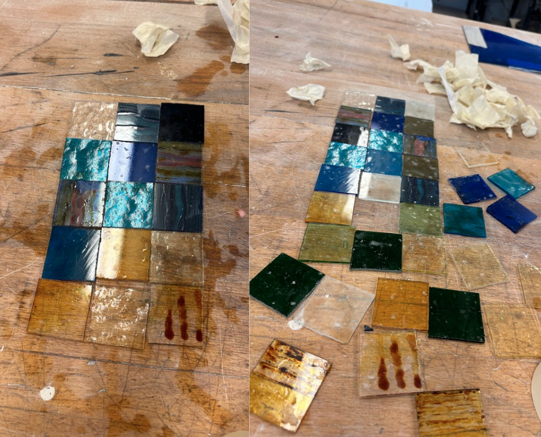 Mijn idee is om een glaskunstwerk te maken, maar niet op de traditionele manier van glas-in-lood. Ik wil het glas in epoxy gieten, zodat het een zachtere uitstraling krijgt zonder de metalen lijnen die glas-in-lood kenmerkt. Om dit te testen, heb ik glas meegenomen naar mijn stageschool, de ARH, waar ik samen met havo 5-leerlingen een raam heb gemaakt van vier drielichten. De leerlingen hebben eerst het glas gesneden. Ik had de fotolijsten aan de zijkanten afgekit. Vervolgens goten we er epoxy in, waarna de leerlingen het glas erin konden leggen.