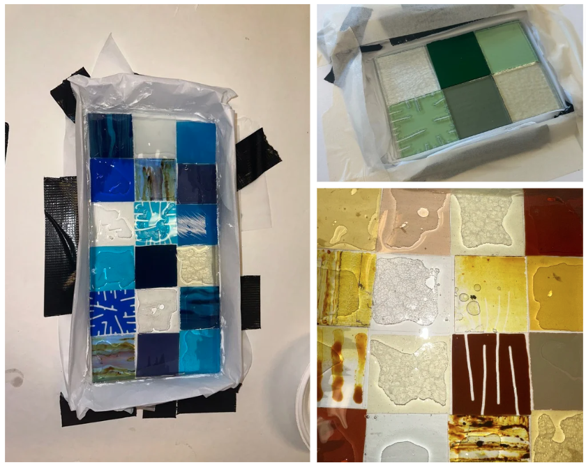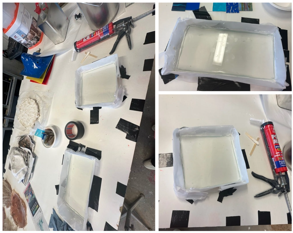 Uiteindelijk besloot ik om het glas in een andere opstelling te plaatsen, omdat de vormen zo beter bij elkaar passen qua verhoudingen. Voor het gieten heb ik eerst een doorzichtige glasplaat op maat gesneden, gelijk aan de gekleurde glasplaat. Deze heb ik in een zelfgemaakte mal geplaatst en de zijkanten afgekit om te voorkomen dat de epoxy erdoorheen zou stromen.