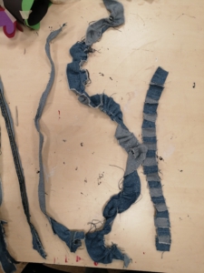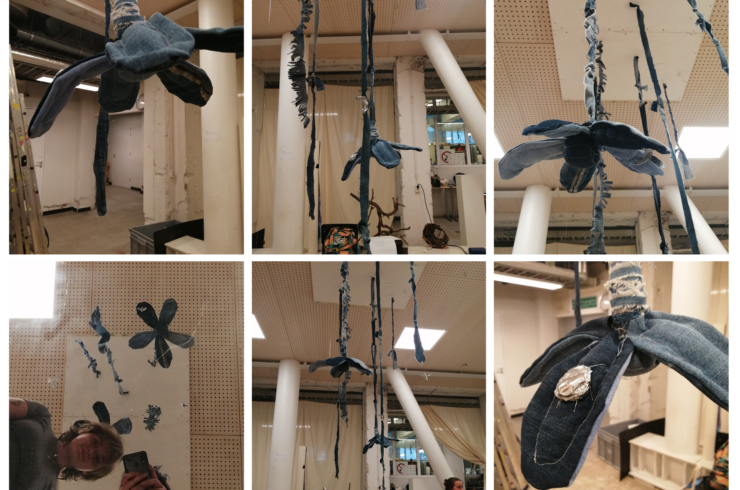 Tijdens de les ging ik kijken hoe ik de bloemen ging ophangen. Mijn eerste idee was aan een metalen ring. Dit vond ik te druk. Hierna heb ik het aan haken aan het plafond gehangen. Dit vond ik al beter omdat er meer ruimte tussen de bloemen zat. Omdat ik nog meer insecten en denim slierten wouw op hangen heb ik hier een constructie voor moeten bedenken.
