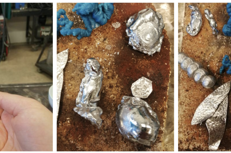 Ik was niet te vrede met de uitkomst van de bij. Hierom vroeg ik me af of ik het abstracter kon maken maar wel dat je er een insect in herkent. Hierom kwam ik met het idee om hete zamac in water te gieten. Uitkomst hiervan waren abstracten vormen die al leken op lichaampjes van insecten.