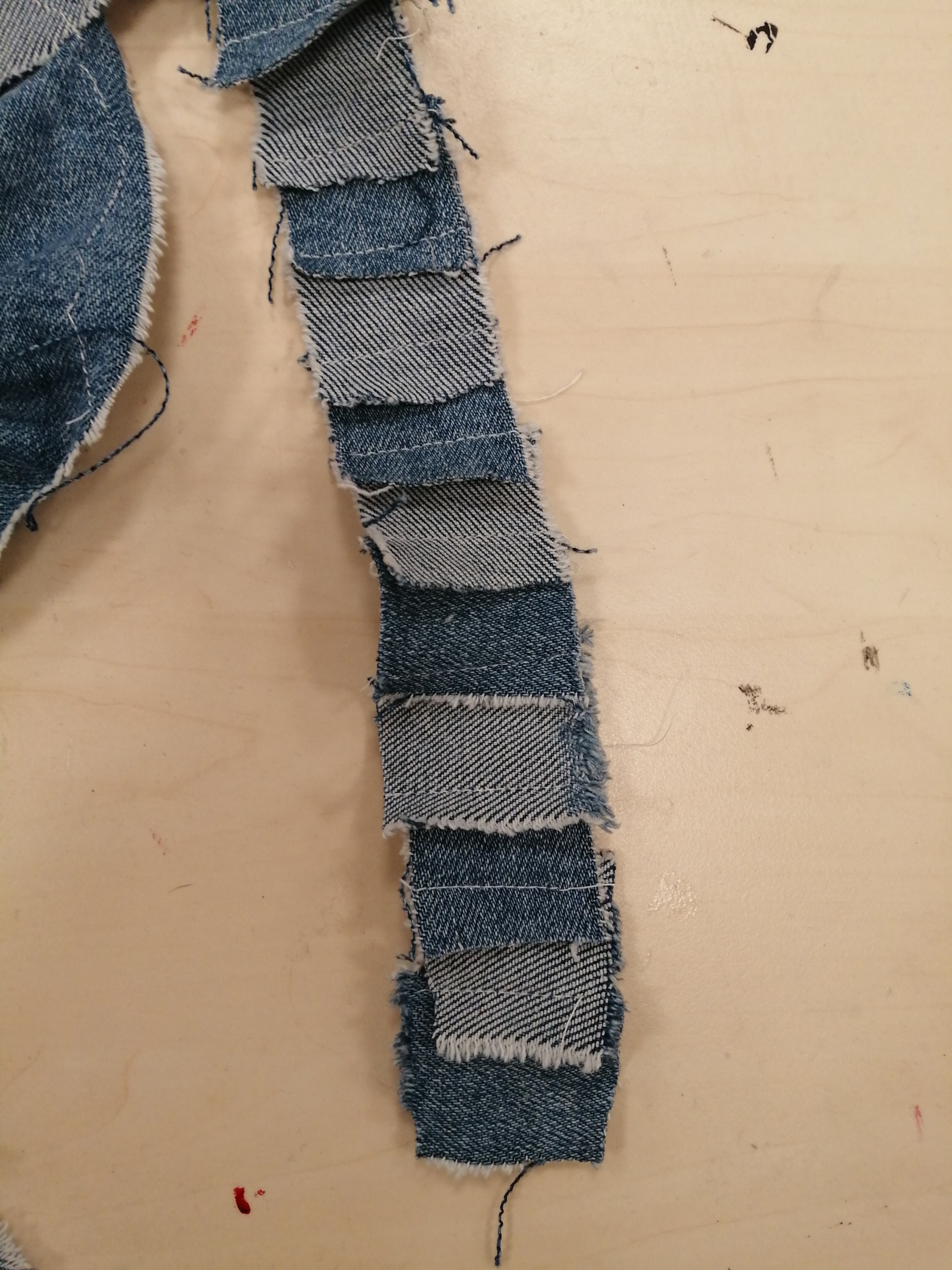 Elk blad is gemaakt van twee verschillende denim stukken. Elk blaadje heeft dus een apart patroon/kleur. Ik heb een gleuf gemaakt aan de binnenkant van elk blad waar metaal door heen zit. Hierdoor kan ik de bloemen makkelijk in positie buigen en hangen ze niet naar bende. De bladen heb ik daarna opgevuld en aan elkaar gemonteerd.
